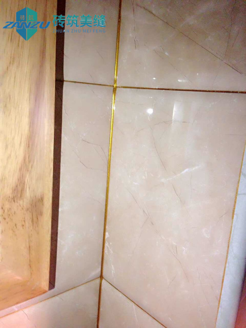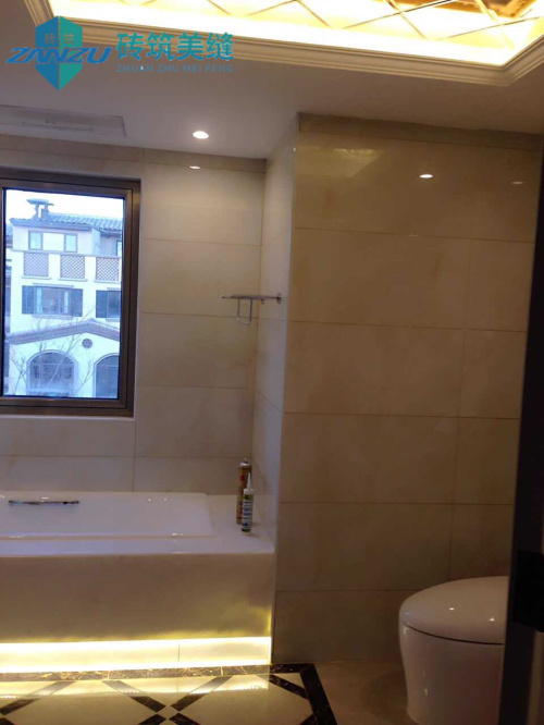 在做美缝施工中,是否能完美地将勾缝填充完整,从而隔绝外部的水汽,是十分考验美缝技师作业水准的。我们在业主的要求下,选择了金色作为主要填充色,使得整体空间更有立体感。较宽的勾缝需要施工人员对胶枪出料量有很强的把控,既不能多也不能少。
