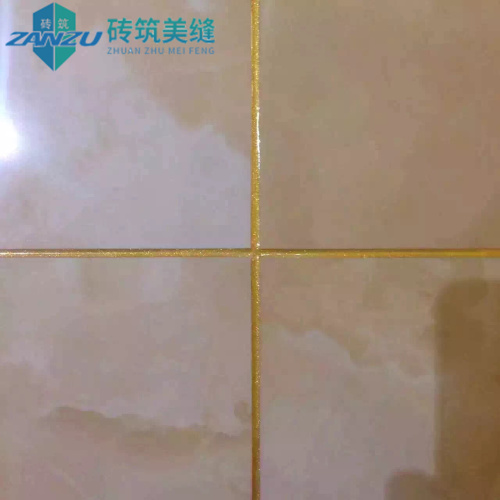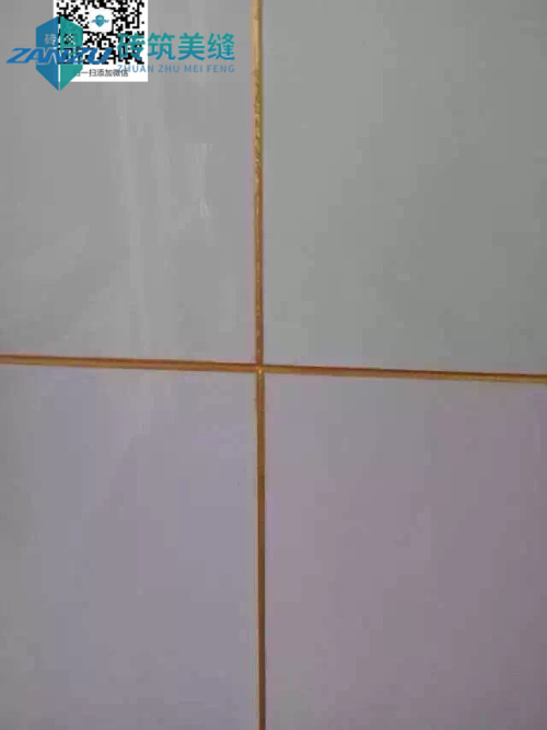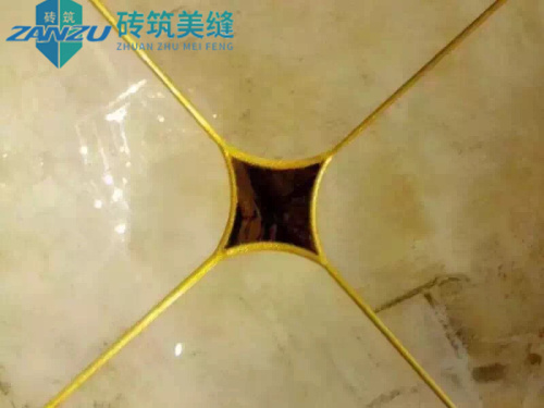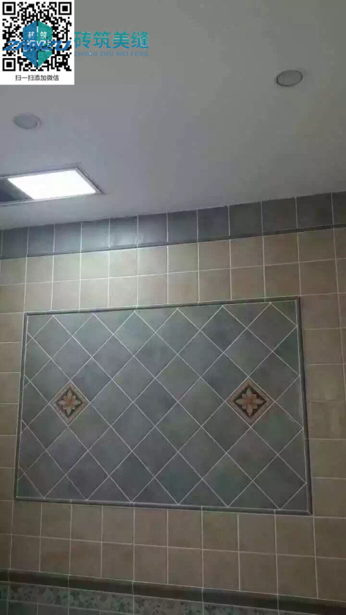 在这类拼花施工中,装饰用的小型砖是施工难点,在此处的填缝需仔细。我们使用专业胶枪,配合美纹纸,将填充的误差降到最低,确保每条勾缝都平滑、无气泡,同时在交点交叉处平滑过渡,纵横线的交点无余料渗出。
