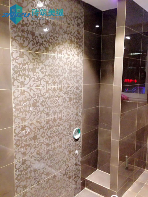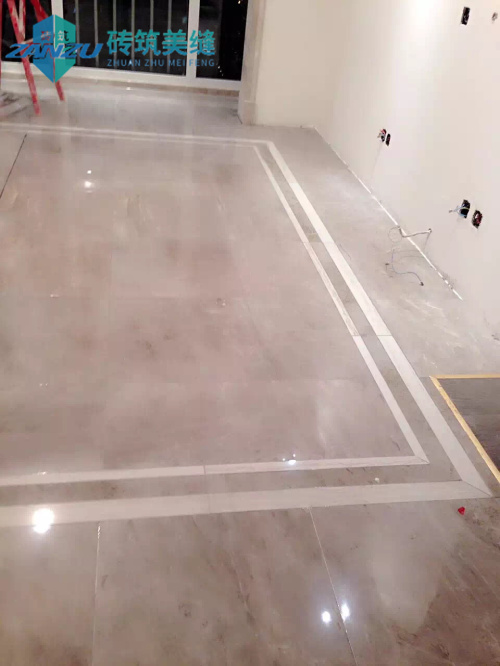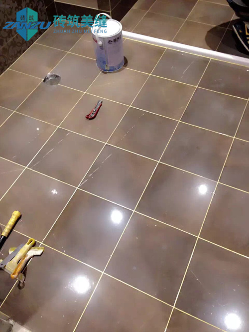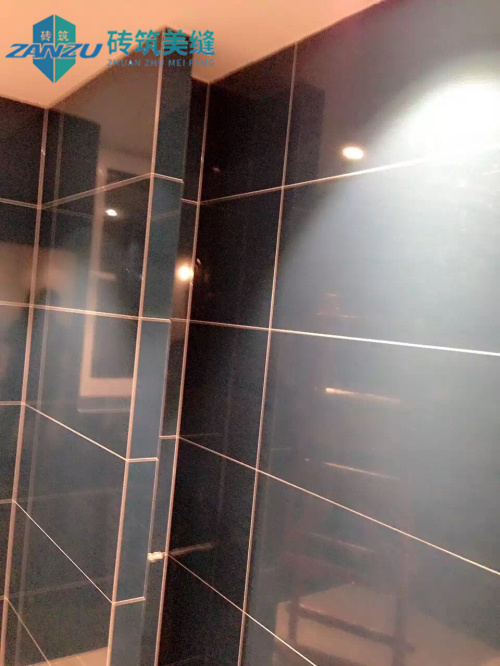 在处理墙体的阴阳角时,尤其是踢脚线上的勾缝时,我们特别注意使用美纹纸,严格按照瓷缝的走向注入瓷缝剂,杜绝瑕疵。当然,也考虑到了拼砖部分的勾缝填充难度。本案中的地砖色调较深,在瓷缝剂的挑选上,我们选择了白搭的白色