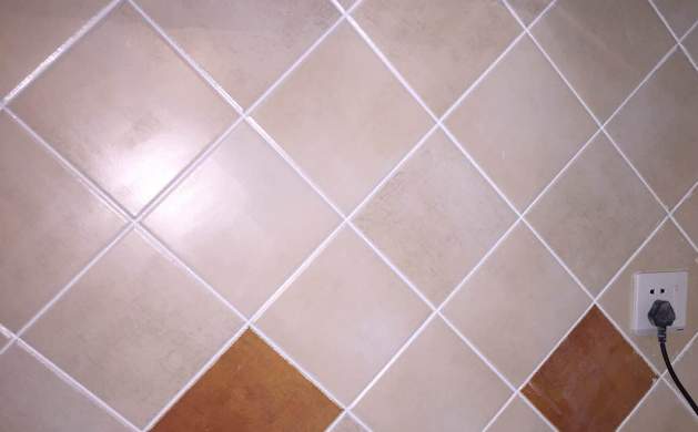 在对美缝施工进行处理时,我们也考虑到了拼砖部分的美缝填充难度。在拼花瓷砖的施工中,装饰用的小型砖是施工难点,在此处的填缝需仔细。我们使用专业胶枪,配合美纹纸,将填充的误差降到最低,确保每条勾缝都平滑、无气泡,同时在交点交叉处平滑过渡,纵横线的交点无余料渗出。