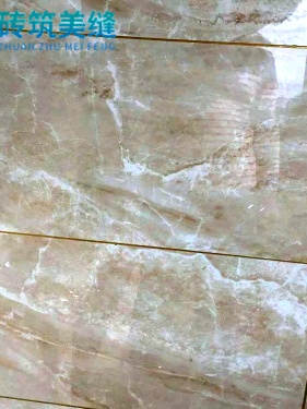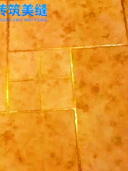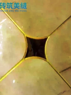 在这类拼花施工中,装饰用的小型砖是美缝施工难点,在此处的填缝需仔细。我们使用专业胶枪,配合美纹纸,将填充的误差降到最低,确保每条勾缝都平滑、无气泡,同时在交点交叉处平滑过渡,纵横线的交点无余料渗出。 由图中细节可看出,借助高超的施工水平勾描的瓷缝,线条是均匀流畅的,与瓷砖本身完美贴合。
